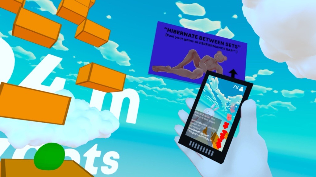 Now you may be wondering about the adjectives used above. For instance, why is the rabbit a narcissist; what makes them gym obsessed? Well, in addition to your characters’ need to jump around ever-changing settings, you’re also a douchebag “gym bro” who has the incessant need to hold your phone out and “stream” your jump with your “social media fans.”