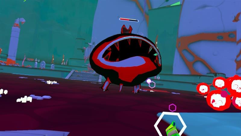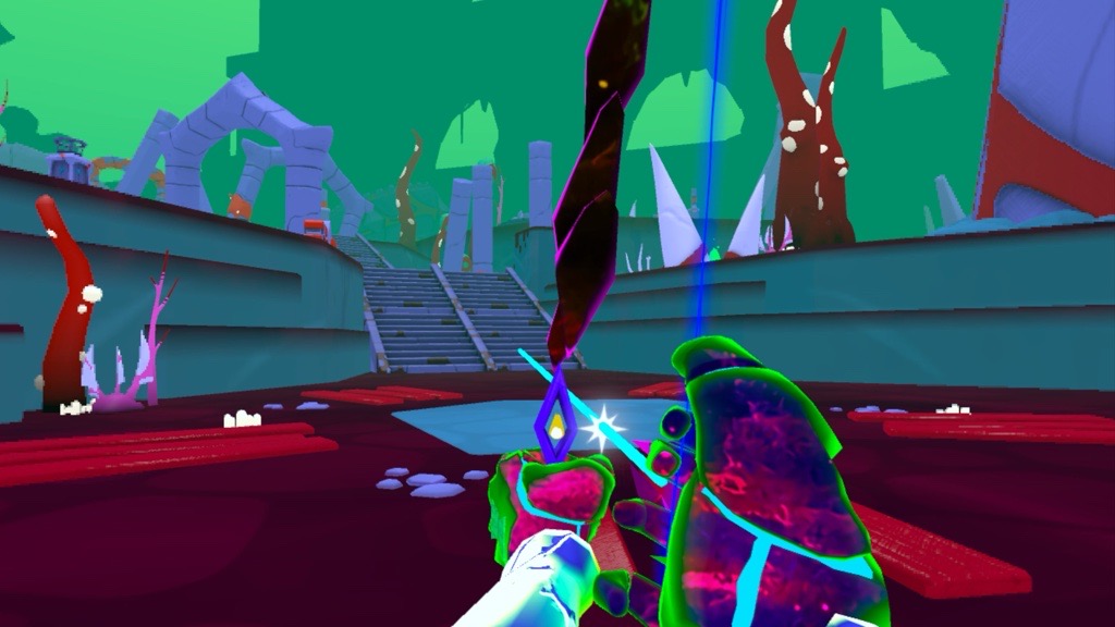 Graphically this game is low quality, on par with what you might expect from a title released on the early Quest or original PlayStation VR headsets. In some games when the world is made of low textures and blocky structures, your character at least looks better. Here this is not the case. Add on top of that the fact that each world is ablaze with colours that are so in your face, you might think you’re on a psychedelic hippie trip.